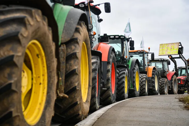Après s’être rassemblés sur le parking d’un hypermarché, en périphérie de Chartres, les tracteurs se sont remis en route. Direction l’autoroute A11, pour une manifestation à durée indéterminée. Une cinquantaine d’engins, encadrée par des motards de la gendarmerie, passe le péage dont la barrière reste levée, et prend la route direction Paris.